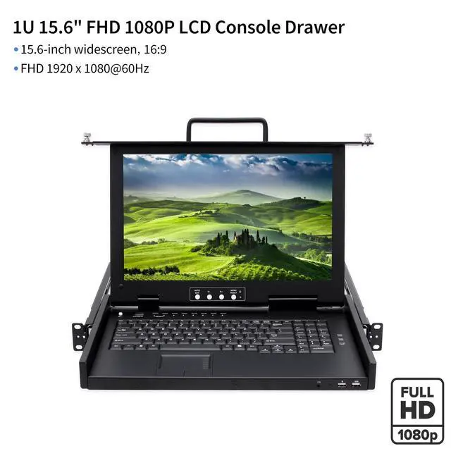 This 8 Port Rack Mount KVM console offers versatile switching via front-panel buttons, convenient keyboard hotkeys, or an intuitive On-Screen Display (OSD) menu. The setup is straightforward with direct cable connections, requiring no complex software, which enables immediate productivity and streamlined system management right out of the box. ^^ The integrated 15.6 -inch FHD TFT LCD monitor provides exceptional visual clarity with 1920x1080 resolution, high brightness, and accurate color reproduction. The console features an ultra-slim keyboard with dedicated numeric pad for efficient data entry, complemented by a high-precision touchpad with scroll wheel functionality.