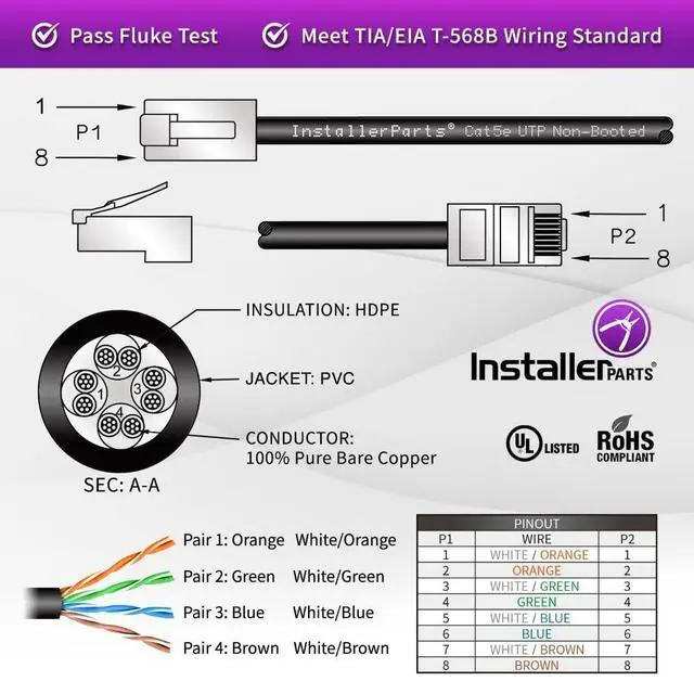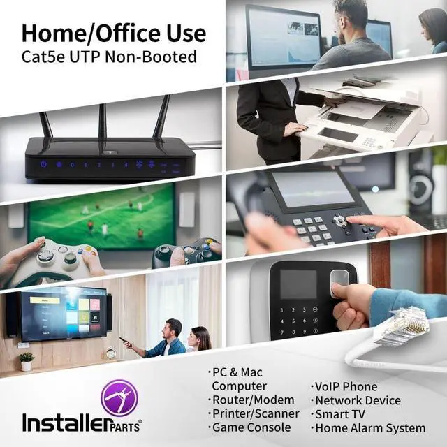 • Non-Booted Cat5E Cable: Installerparts Patch Cables Connect Common Devices On A Local Area Network (Lan), Such As Laptops, Pcs And Mac, Computer Servers, Printers, Modems, Routers, Hubs, Switches, Network Media Players, Nas, Voip Phones, And More.