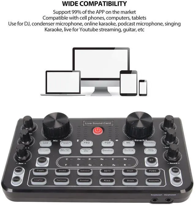 WIDE COMPATIBILITY: Sound mixer board supports 99% of APPs on the market, compatible with cell phones, computers and tablets. Use for DJ, condenser microphone, online karaoke, podcast microphone, singing, Karaoke, live for streaming, guitar, etc5.