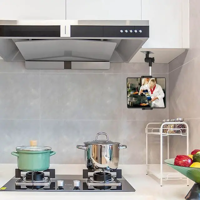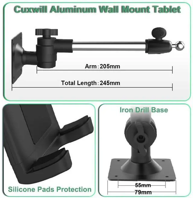 Stable & Durable Wall Mount The universal Cuxwill wall tablet mount is easy to install on any wall. The heavy duty metal iron base, rustproof aluminum alloy arm bracket, ABS material the gear fixed joint and non-slip tablet clip ensure the durability of the equipment and the installation without shaking. The rubber pads on the non-slip tablet clamp can provide cushioning for your device, while providing a firm grip and protection. ^^ Easy To Use Cuxwill tablet wall mount can be mounted in kitchen wall or cabinet to keep the recipes in a good visual plane; also great for the desktop (or wall) of Office, Classrooms, Medical Places, Business, Home, Gym, Retail Store, Showroom, Bedroom to watch video shows and online courses.