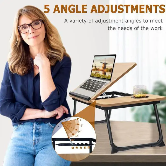 When fold the desktop legs, adjust the desktop angle, and place it on the desktop, which could be used as to laptop stand for desk ^^ 5 Adjustable AnglesA very user-friendly design that can adjust the angle according to youself, making the tibial vertebrae comfortable ^^ Save SpaceWhen not in use, fold and retreat, place it under the bed or the sofa, save space ^^ portableYou can put it in the back of the car when you go out, which is very convenient ^^ Easy to useNo assembly required. Just pull out the foldable legs and adjust the desktop angle ^^ Waterproof desktopAccidentally, if there are water droplets on the desktop, just wipe them off ^^