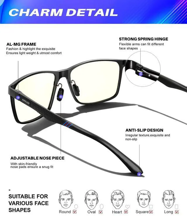 AL-MG design: The womens blue light glasses are made of aluminum-magnesium alloy for excellent durability and lightness. The choice of material makes the blue light glasses for women more durable. It also ensures the lightness of the glasses. The best rated blue light glasses is also resistant to oxidation and abrasion, extending the life of the product and allowing you to enjoy the protection of your blue light glasses for men for a long time ^^