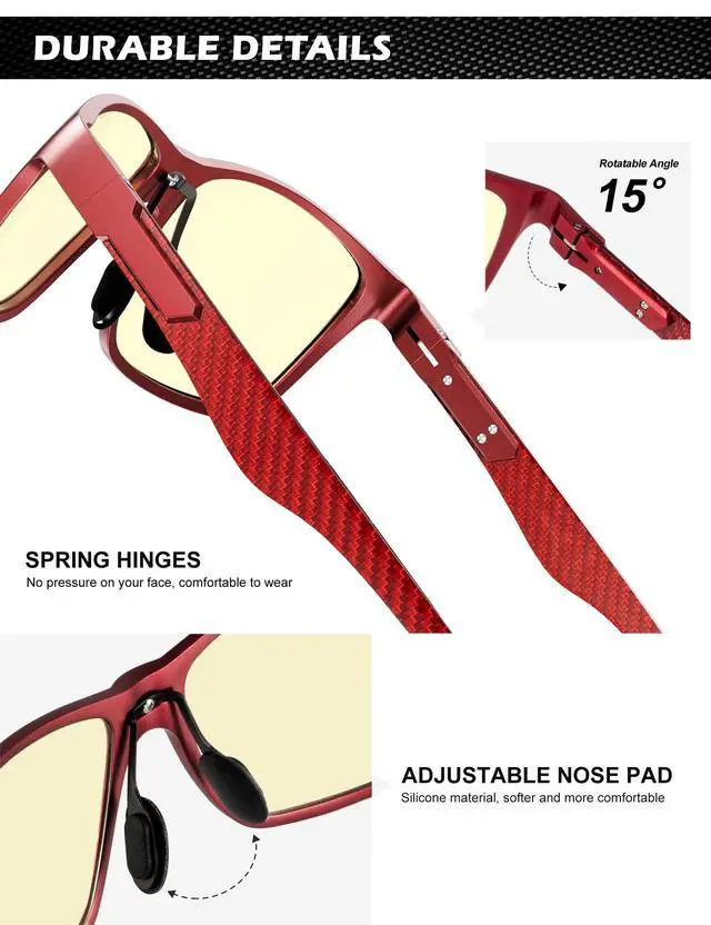 • Premium Temple Material: With superior Al-Mg and carbon fiber composite temple, this type of blue light blocking glasses for men is ultra-light than pure metal frame, also more sturdy. No more worries about broken temples. As more suitable for anyone who often work or play games by the computer, do not miss this pair of practical and classic blue blocker glasses.