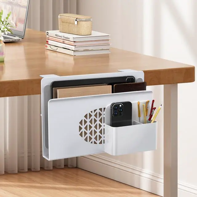 Maximize your workspace with this clamp-on Desk Side Storage. Made of heavy-duty metal, it features a magnetic pen holder and vertical laptop slot. Fits most flat desks ( 0.5" 3.5" ) with pre-installed silicone pads to protect surfacesno drilling required.