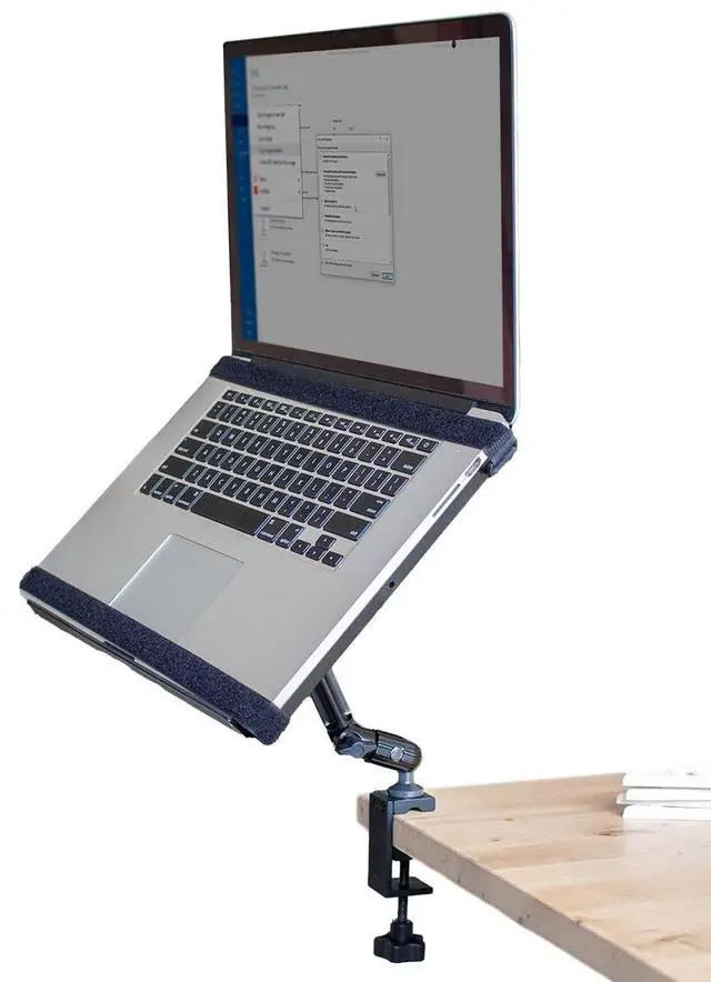 The MDL18 is a universal laptop mount that can be attached to any desktop, tabletop or pole with a secure clamp. It is made of high-quality aluminum that is strong, durable and stylish. You can rotate and adjust your laptop to any angle and position with the swivel joints and adjustable elbows. The laptop tray is spacious and compatible with all laptop notebook computers. It also comes with two safety straps to keep your laptop in place. The MDL18 is easy to install and use, and it will enhance your productivity and comfort.