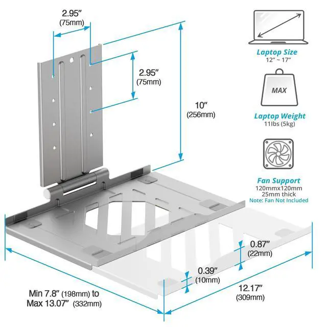 ^^ Wide Compatibility: Fits 12 to 17 in laptops; Tool-free extendable tray design accommodates various sizes; supports laptops with lids that open up to 120.