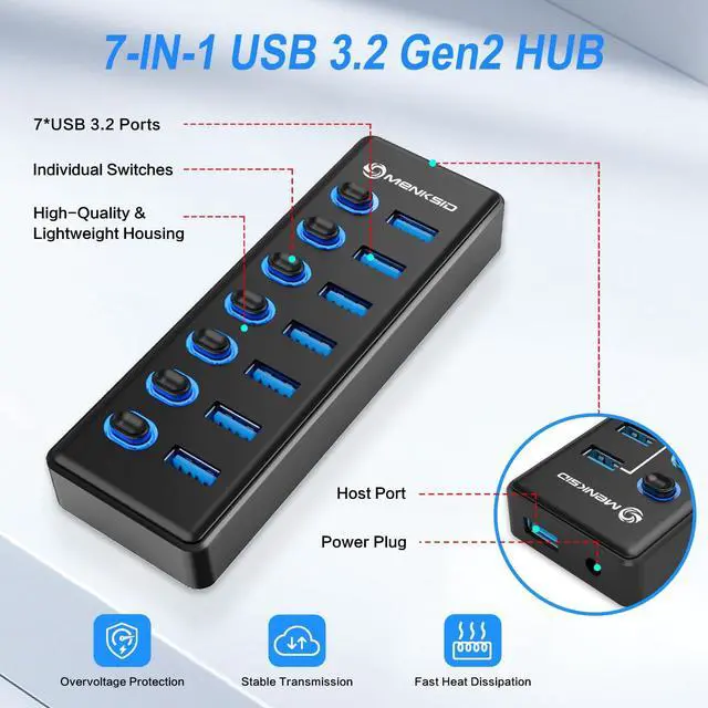 ^^ Individual Switch: The MENKSID Powered USB Hub is designed with individual switches, so you can turn on/off individual USB ports without unplugging the device. In addition, each port has an LED light for you to check the power status. ^^ Safe and