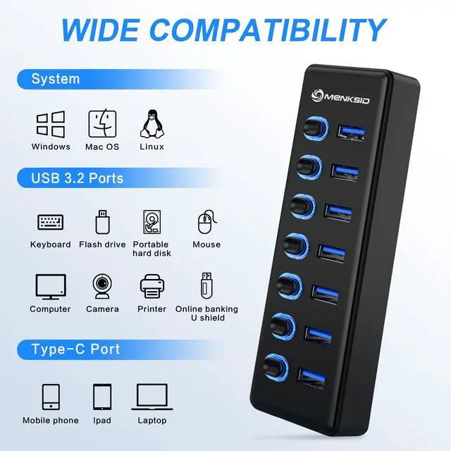 ^^ Wide Compatibility: USB 3.2 Power Hub is compatible with Windows XP / Vista / Win 7 / Win 8 / Win 10, Mac OS, Linux 9 and above, supports any USB 3.2, USB 3.0, USB 2.0, USB 1.1 and USB 1.0 peripheral devices; fully plug and play, no driver required, hot-swappable support.