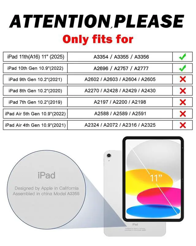 Generation 10.9 inch (Model includes: A3354/A3355/A3356 A2696/A2757/A2777) 2025/2022 Released. NOT fits other Generations iPad. Please confirm the product before purchase ^^ Soft Strap & Portable Shoulder Strap & Rotating Stand: This ipad 11/10 case provide the protection and convenience when you play or work with case for iPad. Hang it anywhere for your entertainment, makes you using iPad case 11th/10th Generation easily. 360 Degrees rotating Kickstand provides convenient viewing, with soft strap, easy to use your 10th/11th gen ipad case in your outdoor travelling, working, gaming with kids ^^