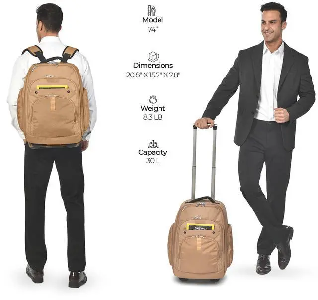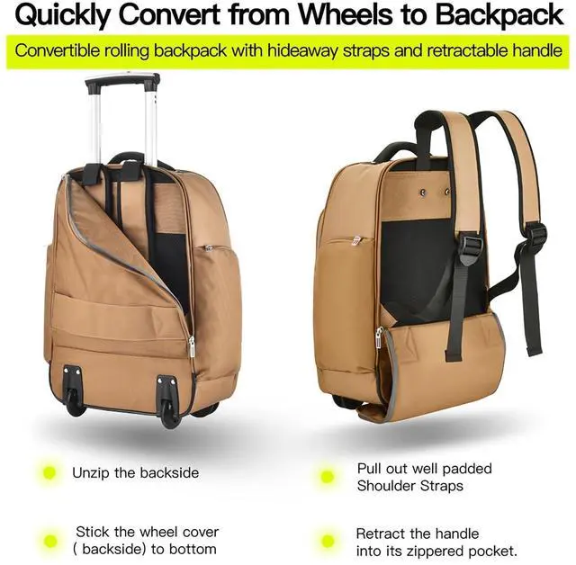 Built to Last with Premium MaterialsFeel the durability with every touch. Crafted from heavyweight 1680D polyester with laminated fabric, this rolling backpack resists wear, tear, and the elements. The water-resistant design keeps your belongings safe, while the smooth, snag-free antibroken zippers ensure effortless access. Long-lasting quality that makes every journey smoother, year after year. ^^ Comfortable and Ergonomic Travel ExperienceSwitch effortlessly between rolling and carrying. Hidden shoulder straps allow you to transition from rolling through the airport to carrying the bag on your back in an instant. Feel the comfort on your shoulders and back with adjustable straps that evenly distribute weight.