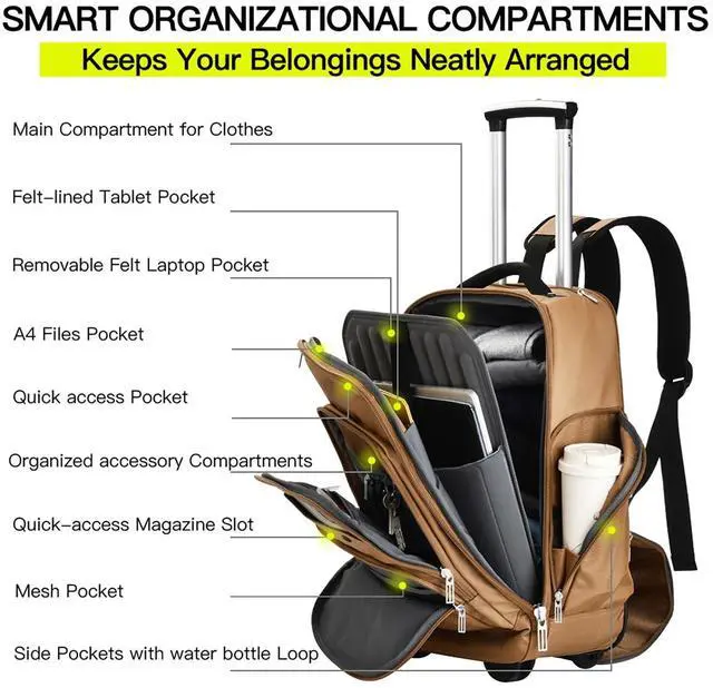 ^^ Sturdy and Reliable for Frequent TravelBuilt to withstand your busiest days. Featuring a heavy-duty aluminum trolley system, this rolling backpack is ready for daily commutes and business trips. The durable 1680D fabric, paired with water-resistant protection, keeps your gear safe and secure. Dependable for every trip. Stay confident in a bag that offers smooth maneuverability and reliable performance day after day. ^^ Ideal for Professionals on the GoDesigned for professionals who demand more. Whether you're a business executive, consultant, or photographer, this versatile rolling backpack delivers durable, organized storage with quick access to all your gear.