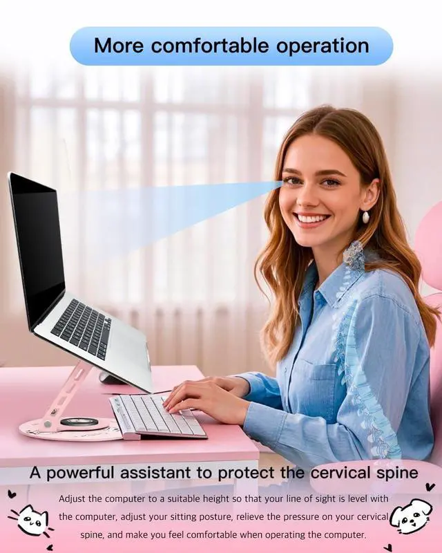 Rotation+Adorable Pet-Themed Design: This portable laptop riser centered round base isnt just functionalits fun! Weve added exclusive Q-version dog cartoon motifs to the rotating (base) and a tiny paw-shaped center axle that spins with you, adding a playful touch to your workspace. Rotate infinitely in either direction for flexible working positionsperfect for group projects, meetings, or sharing your screen with fellow pet lovers ^^