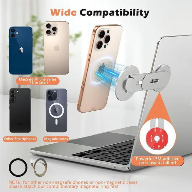 WIDE COMPATIBILITY: ALAFLY Magnetic phone Holder is designed for iPhone 17 16 15 14 13 12 series, MagSafe case and other phones or cases with metal ring attached, fitting effortlessly onto laptops, desktop, tablet, Tesla model 3/X/Y/S ^^