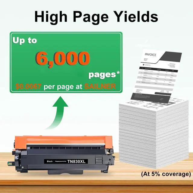 Higher Page Yields: The compatible tn830 toner cartridge delivers up to 3, 000 pages per cartridge (6, 000 pages total), reducing your printing expenses with high-yield efficiency. With SAILNER's high-yield page compatible TN830XL toner cartridge, you'll achieve a cost per page of approximately US$ 0.0067 ^^
