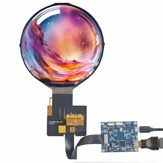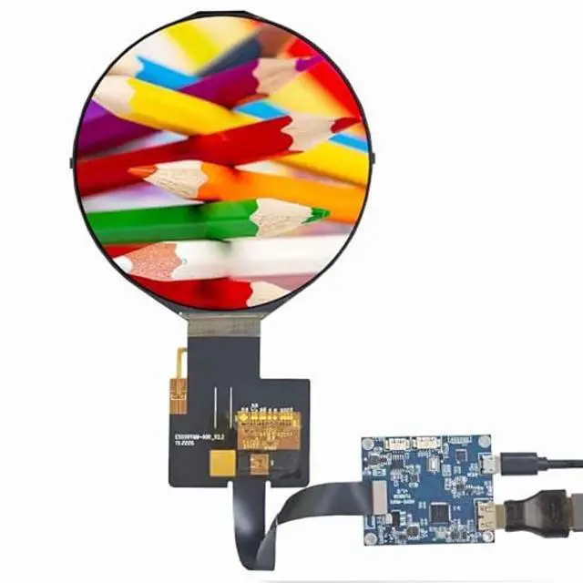 Circle Screen: Display Mode TN, Normally White, TransmissiveResolution 1080 (RGB) x1080Outline Size 136.53 x 132.58 x2 (WHD) mmDisplay Area 127.008 x 127.008 (WH) mmBrightness 350 cd/m (Typ. )Contrast Ratio 300:1 (Typ. ) (TM) Viewing Angle 85/85/85/85 (Typ. ) (CR10) [Left / Right / Up / Down]Interface Mipi (1 ch, 8-bit), 50 pins, Backlight WLED