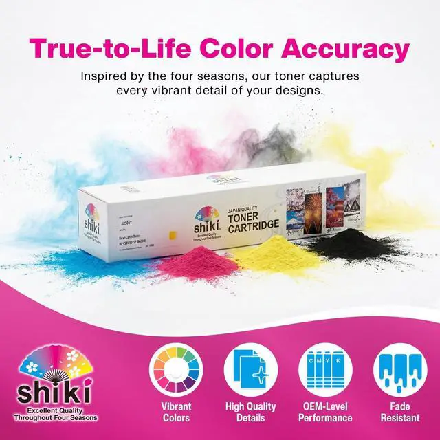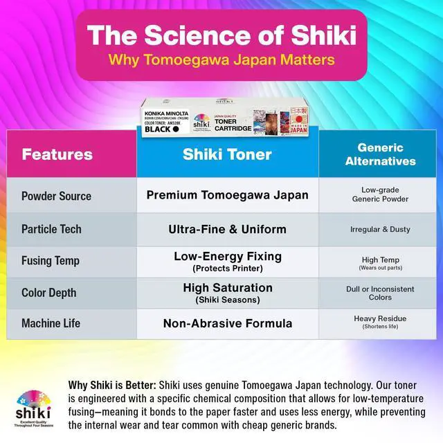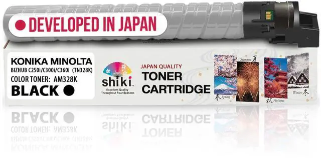 Color: Black / Compatible Toner Cartridge Replacement for Konica Minolta bizhub C250i C300i C360i TN328K AAV8130 (Black, 28000 Pages) ^^ Developed using Japanese technologies, shiki yields outstanding printing quality that can vividly express the various scenes of shiki, or four seasons in Japanese. ^^ Having passed all of our tests, shiki has the quality that is equally high as OEM products in page yield and other quality indexes. ^^ To enjoy the highest printing quality, we recommend using the shiki brand for all four colors. ^^ Excellent Quality Throughout Four Seasons ^^ SHIKI contains high-grade toner that has passed the most rigorous environmental testing and maintains a stable and excellent quality throughout four seasons. *shiki () in Japanese means four seasons.