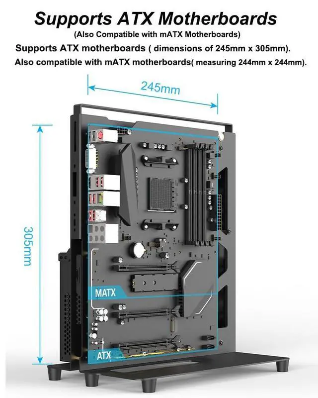 Motherboard Support: Supports ATX, MATX, and ITX motherboards. Compatible with ATX motherboards of 245*305mm specification, downward compatible with MATX motherboards of 244*244mm specification.