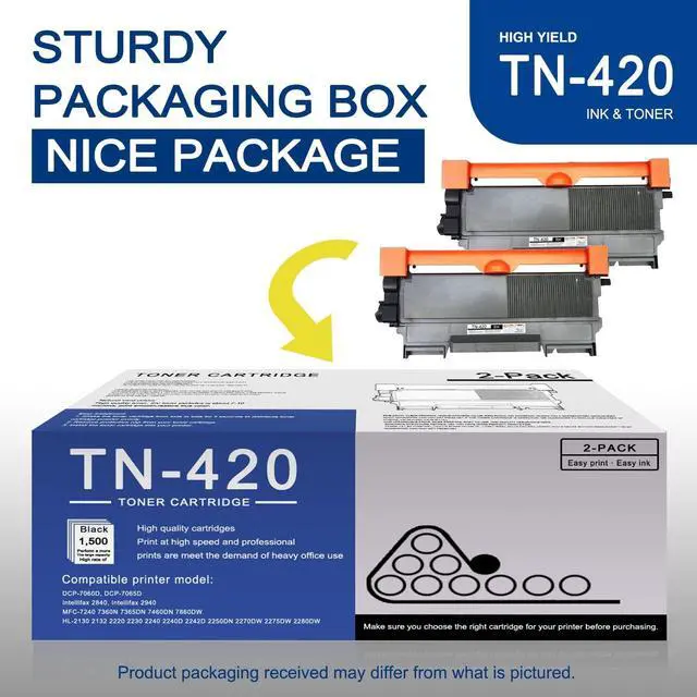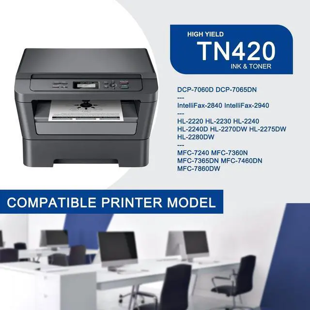 ^^ Printer Compatibility: TN420 toner cartridges Replacement for Brother DCP-7060D DCP-7065DN IntelliFax-2840 IntelliFax-2940 HL-2220 HL-2230 HL-2240 HL-2240D HL-2270DW HL-2275DW HL-2280DW MFC-7240 MFC-7360N MFC-7365DN MFC-7460DNMFC-7860DW Printer (Before placing your order, please confirm that your printer model is compatible with this cartridge).