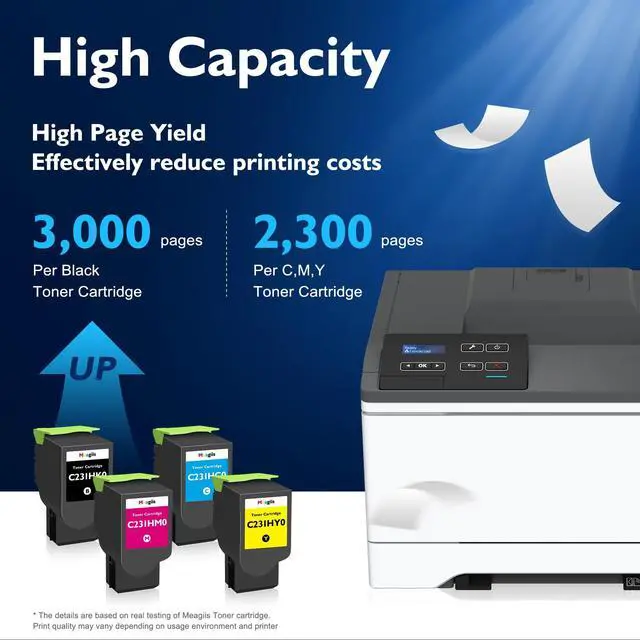 High Page Yield: 3, 000 pages per C231HK0 Black Toner Cartridge and 2, 300 pages per C231HY0 C231HC0 C231HM0 color toner at 5% coverage of Letter/A4 ^^