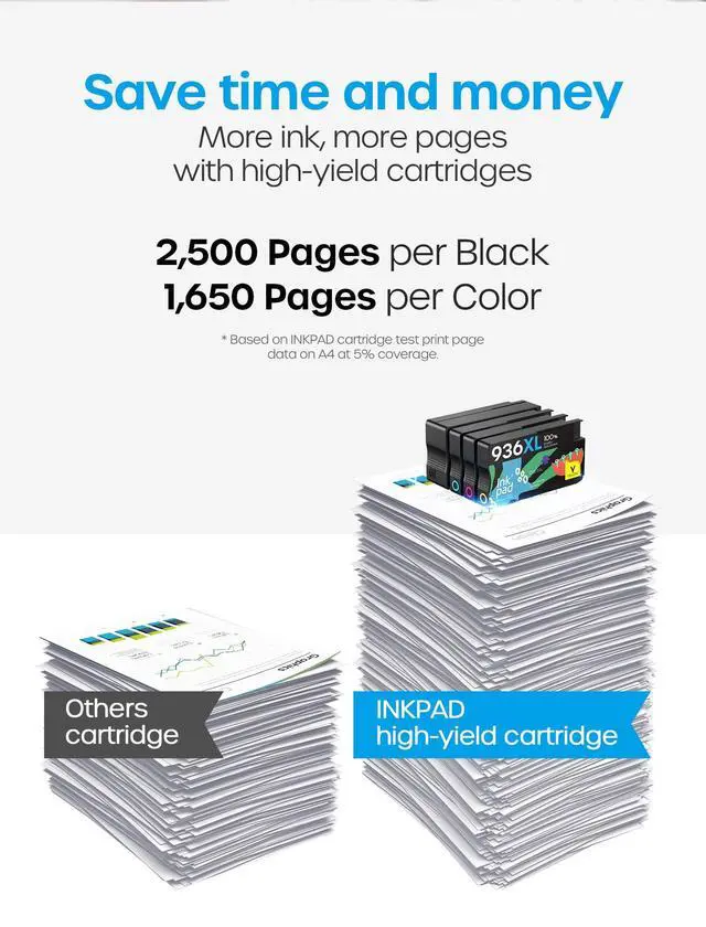 High Page Yield: Up to 2, 500 pages for 936XL Black Ink and 1, 650 pages for 936XL Color Ink at 5% coverage (A4e letter) ^^