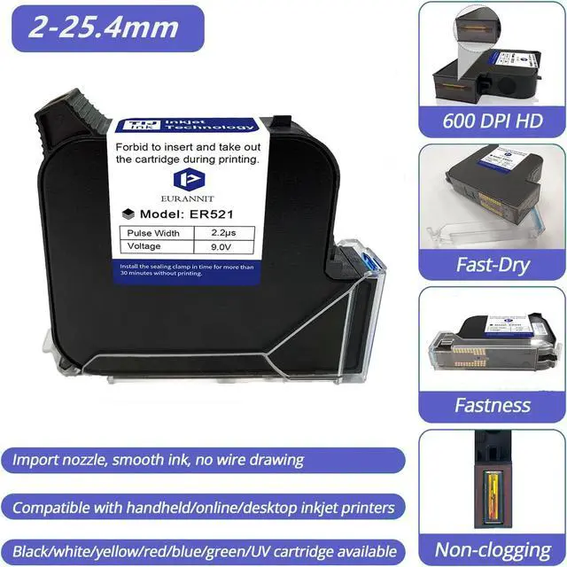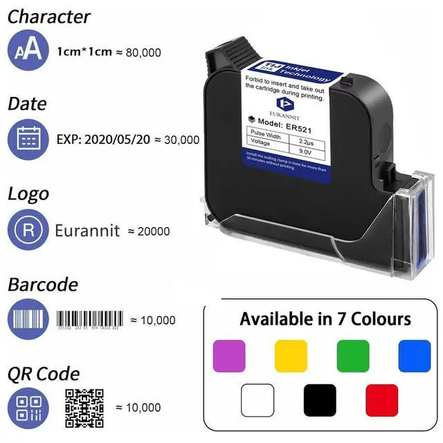 High Capacity Ink Cartridge--- Eurannit 1 inch ink cartridge has a large capacity of 72ml ink, which can print about 3, 000, 000 characters at the minimum print height, intelligently saving ink and ensuring long-lasting performance. ^^ Smooth Printing Experience--- The handheld printer ink cartridge is designed with high-density printing, which prints smoothly, with vivid colors and strong adhesion. Ensure smooth, crisp prints and accurate quality every time. ^^ Quick-Drying Technology--- The industrial-grade ink inside our cartridges dries really fast, making it sturdy and waterproof for all your printing needs.