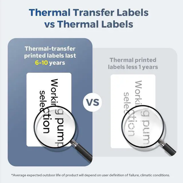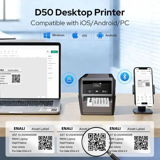 2-Inch Print Head for Versatile Applications - Create everything from cable labels and data&telecommunications labeling to asset tracking, electrical labeling, laboratory labels, safety identification, warehouse marking, component and equipment labeling, circuit board labeling and general identification. ^^ Outstanding Print Quality - Utilizing thermal transfer printing technology, our labels maintain their clarity for up to 5 years without fading. With a 300 DPI resolution, enjoy sharper prints and minimal margins, ensuring no label paper is wasted. ^^ Enhanced Efficiency - D50 label printer is equipped with an automatic cutter for effortless bulk label cutting.