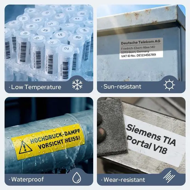 Our integrated label and ribbon cartridge design allows for consumable changes in just 5 seconds. ^^ Mobile and PC Compatibility - Connect via mobile app for easy printing or use PC software for more flexible editing options. With a powerful 2600mAh battery, enjoy an impressive standby time of up to 90 days! ^^ Ultra-Strong Adhesive - Featuring a specially tested acrylic adhesive, our labels adhere firmly to rough surfaces, standing strong against oil, low temperatures, and harsh outdoor conditions.