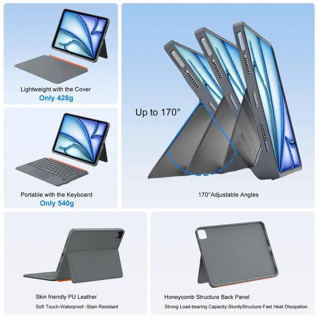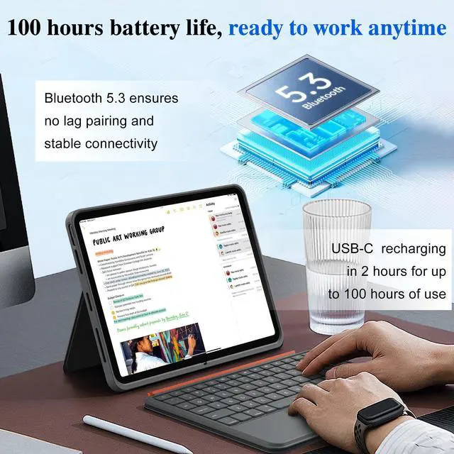 Bluetooth No Lag: iPad m3 11 inch case with keyboard just 0.25 inch ultra-thin design. The foldable stand adjusts from 0to 170, fill needs for different angles. Bluetooth 5.3 ensures instant, no lag pairing and stable connectivity. Easily switch to work mode during commutes or in cafes ^^ Silent Backlit Keys & Long