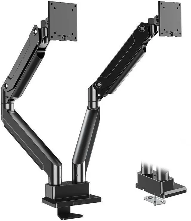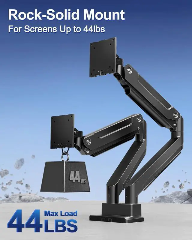 Better Still, the arm has been thicker by 30% and is made of reinforced heavy-duty steel and premium aluminum, ensuring long-lasting support and enhanced screen stability for various setups. The internal gas spring has undergone fatigue tests to ensure the arm is strong and durable ^^ Enjoy Optimal Viewing Angle - Our vesa dual monitor mount features excellent flexibility and adjustability. The monitor can tilt up to 45or down to 35for the ideal angle, swivel 90 left or right for effortless screen sharing, and 25leveling after installation to fine-tune the monitor's position. The advanced gas spring arm can be extended to 23.6 for flexible, comfortable viewing and offers an adjustable height range of 8.4" ~ 22.6".