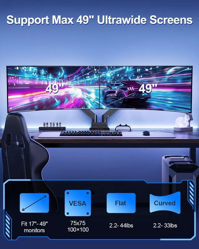 Fits up to 44lbs Ultrawide Screens - Dual mechanical spring monitor mount fits 2 ultra-wide screens up to 49" with VESA 75x75mm or 100x100mm. Each arm supports curved screens weighing 2.2 -33 lbs and flat screens weighing 2.2 - 44 lbs. Compatible with Samsung Odyssey G9, LG, Dell, ASUS, Acer, MSI, HP, Sceptre, and other ultrawide monitors, covers common sizes like 49", 43", 42", 39", 38", 35", 34", 32", 27", 24", 22" displays. Please note that the VESA adapter for Samsung monitors is not included ^^ Enhanced Stability - The reinforced tilt mechanism of this dual monitor arm is updated for improved support to keep the screen from sagging.