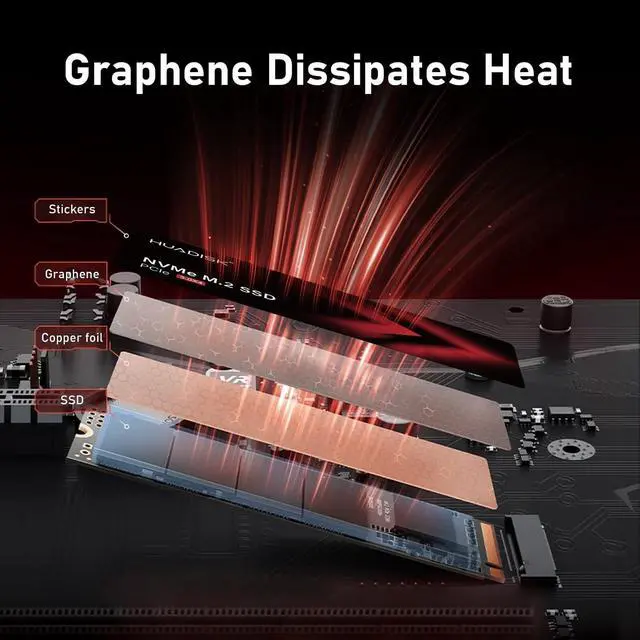 SSD Graphene Cool: Huadisk NVMe SSD M2 has graphene layers for heat dissipation. Graphene, cuts the internal ssd drive temp by up to 10C (), avoiding overheating in heavy tasks like transfers, 4K editing, gaming for stable, long-lasting use ^^