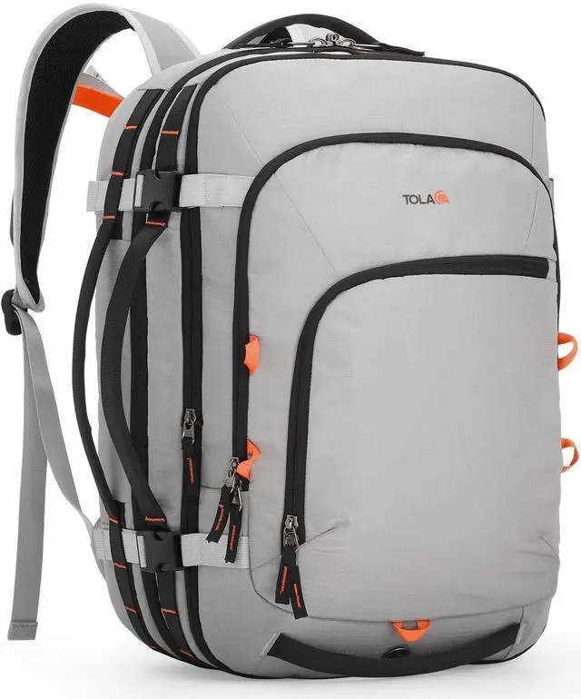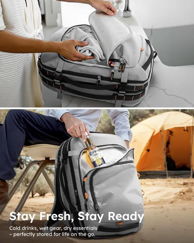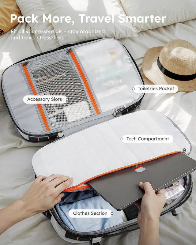 S. airlines as a carry-on, it fits easily in overhead compartments. Ideal for business travel, weekend escapes, and frequent flyers who want to move with ease. ^^ Expandable 35L to 45L VersatilityPack just right every time. Expand from 35L to 45L to suit your schedule - commutes, gym sessions, or 3-5 day getaways. With dual main compartments, waterproof aluminum-lined wet/dry dividers, and smart internal organization, this expandable versatile travel backpack keeps everything in place without feeling bulky. ^^ All-Day Comfort, Built for Real LifeStay comfortable wherever the day takes you.