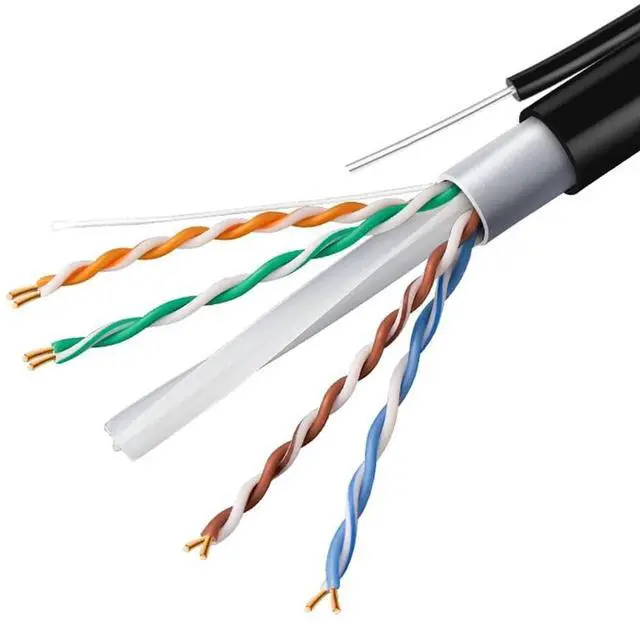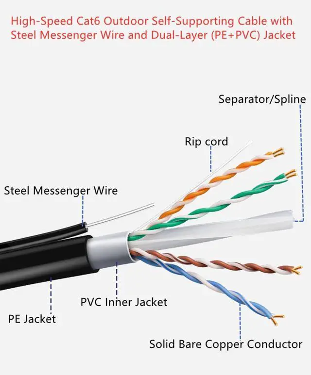 This CAT6 outdoor Ethernet cable features a unique self-supporting design with a steel messenger wire, allowing it to be used for a wide range of applications, including overhead installations and other challenging environments. With 100% pure copper conductors, this cable delivers superior performance and ensures your network connection stays fast and reliable. This cable features a double-layer sheath structure made of PE and PVC, providing excellent resistance to UV rays, aging, wind, rain, and cold temperatures. The cable is waterproof and UV-resistant, making it perfect for outdoor use in any weather condition.
