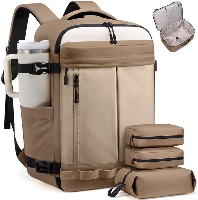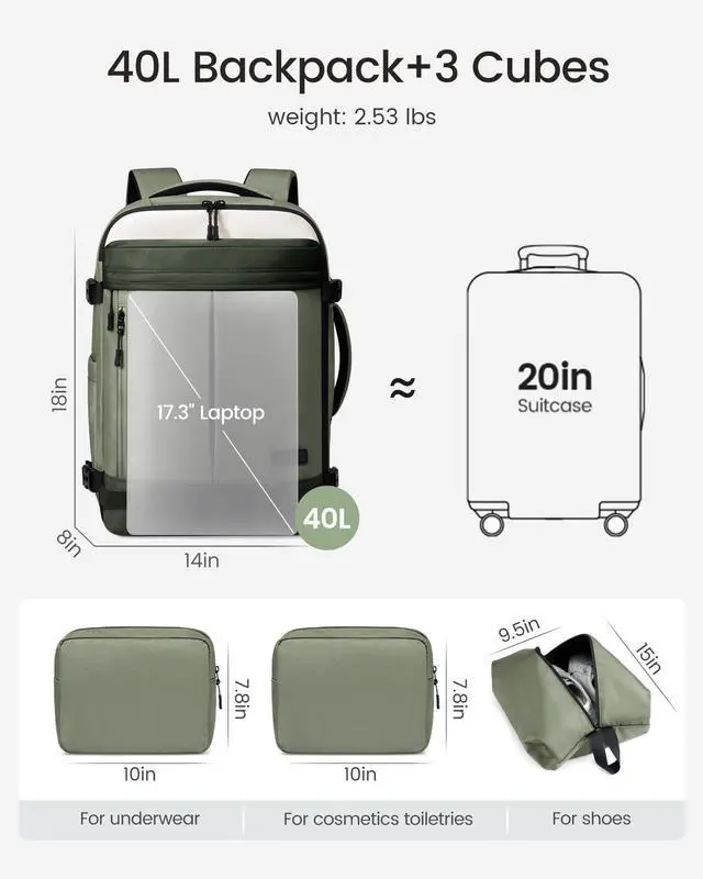 Airline Approved Carry-OnMeasuring 14818 inches, this travel backpack fits under the seat or in overhead bins. Approved by Spirit, Frontier, JetBlue, and more, its the perfect personal item travel bag for short trips, business flights, and weekend getaways. ^^ 40L Capacity One Bag, Everything PackedWith a spacious 40L design and 180 suitcase-style opening, this carry on backpack makes packing effortless. The roomy main compartment, mesh pocket, and wet section organize clothes, toiletries, and travel essentials for 35 days. ^^ 3 Packing Cubes IncludedThis travel bag comes with 2 packing pouches for toiletries and undergarments plus a separate shoe bag.