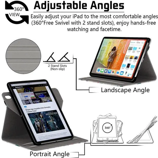 ^^ [360 Degrees Viewing]: 360 degrees rotating and built-in 2 non-slip grooves stand, it allows you to rotate the case tablet to use it vertically and horizontally.