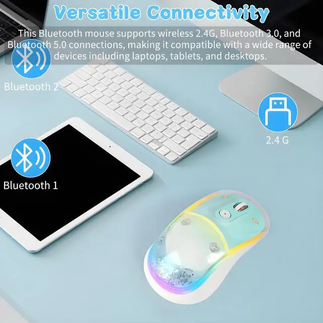 ^^ **Customizable DPI Settings**: Easily switch between 800, 1200, 1600, and 2400 DPI settings with a single button press to suit your browsing or gaming needs. ^^ **Long-Lasting Rechargeable Battery** Built-in 500mAh rechargeable lithium battery with up to 365 days of standby time. Enjoy 15 days of continuous use with lights on, and up to 90 days with lights off. ^^ **Perfect for All Users** Whether you're a student, professional, or gamer, this mouse suits all your needs. Its multi-mode connectivity ensures it's versatile for all devices, making it ideal for both work and leisure.