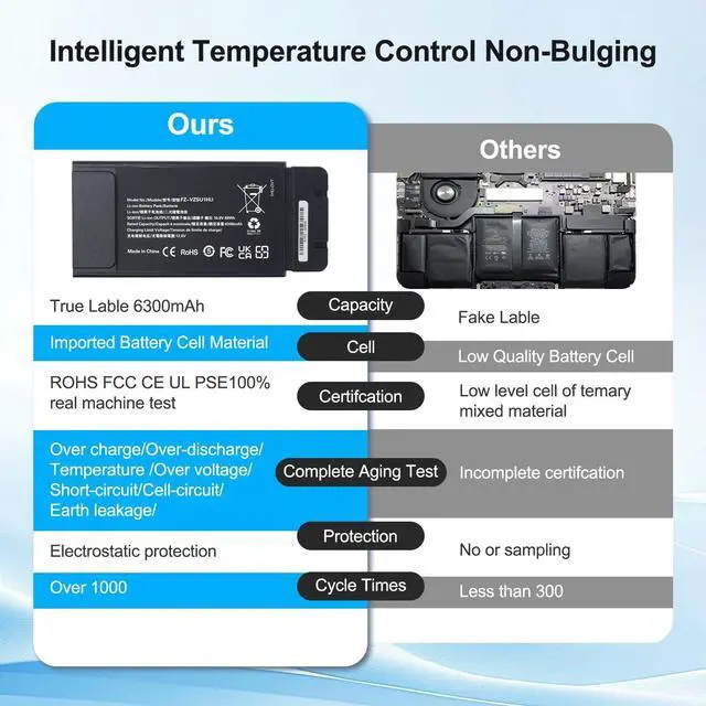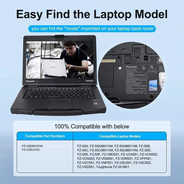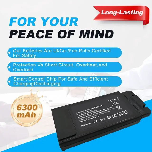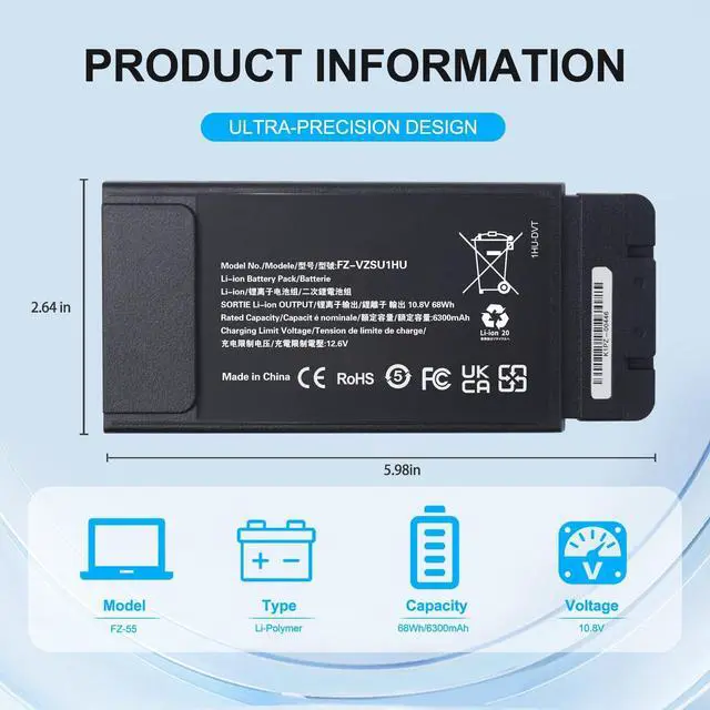 High-Capacity Power Performance This FZ-VZSU1HU Replacement Battery for Panasonic Toughbook FZ-55 delivers 68Wh / 6300mAh of long-lasting power at 10.8V. Built with a fully decoded control chip, it communicates seamlessly with the laptop and performs exactly like the original FZ-55 battery. Enjoy extended runtime and stable performance for your Panasonic Toughbook FZ-55. ^^ Perfect Compatibility Engineered exclusively for Panasonic Toughbook FZ-55 Mk1 models, ensuring precise fit, full functionality, and reliable performance. ^^ Comprehensive Safety Protection Integrated with multi-layer safety systems, including overcharge, overheat, over-discharge, short-circuit, over-current, and overvoltage protection.