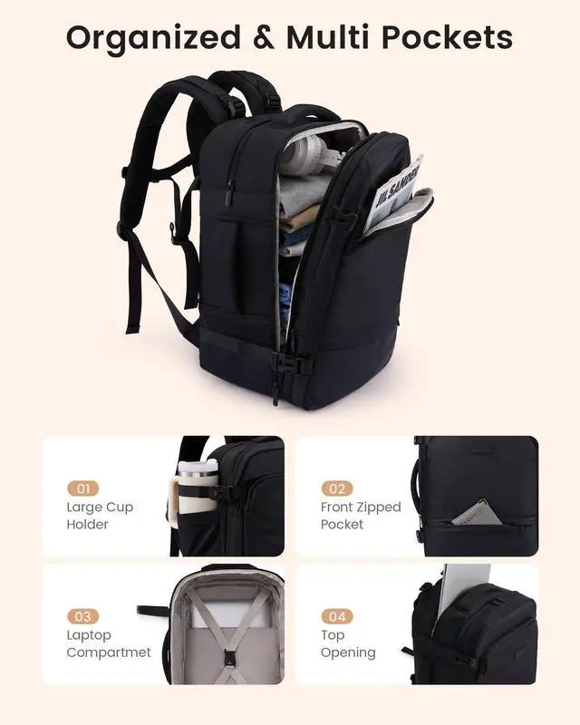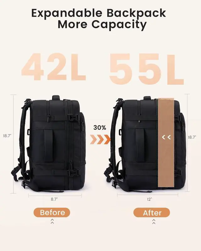 Expansive Capacity & Smart Organization: This versatile backpack has an expandable main compartment to adjust capacity for daily commutes or short trips, making it a practical travel essentials. It features multiple handy pockets, a waterproof section and padded laptop sleeve, working well as everyday laptop backpack and reliable carry on backpack. Switch easily between a tidy daily bag and roomy travel pack, keeping your belongings neat and secure on the go. ^^ With 2