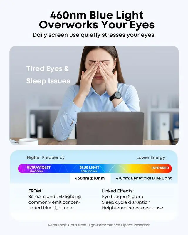 Powerful Eye ProtectionBlocks 87% of harmful 460nm blue light (the leading cause of digital eye strain) and 97% of UV rays. Reduces eye fatigue, dryness, and sleep disruption from long hours of work, gaming, or streaming. ^^ Removable Hanging Design - No HassleNo tools, adhesives, or permanent installation required. Hang in seconds for instant protection, remove easily, and reattach anytime. Perfect for home offices, remote workers, students, and anyone who hates complicated setups. ^^ 93% HD Clarity & True ColorsHigh light transmittance delivers sharp, vivid visuals with zero blurriness or color distortion.
