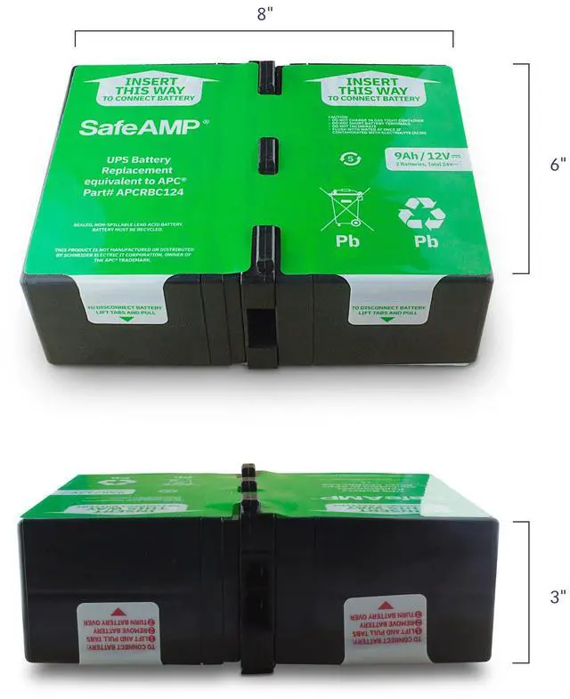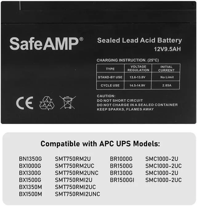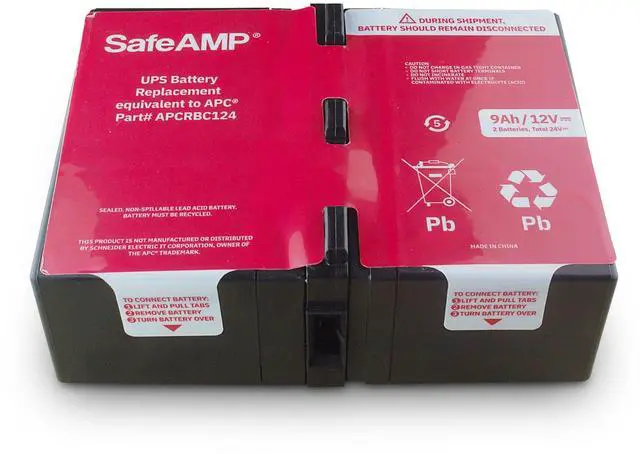 [Compatibility] Compatible with Compatible with APC UPS models BR1500G, BX1500M, BR1300G, SMC1000-2U, SMC1000-2UC, BR1500GI, BX1500G, SMC1000-2U, SMC1000-2UC, and select others. This is a SafeAMP branded battery. ^^ [Performance] Composed of a pair of 9.5A h 12V batteries. The SafeAmp UPS Battery is a direct replacement for RBC124. Will also replace RBC123. ^^ [Quality Battery] Our SafeAmp Compatible Replacement Battery Cartridges (RBC) are tested and certified for compatibility to restore the performance of your UPS to original specifications ^^ [Technical Information] 9Ah, 24V DC.