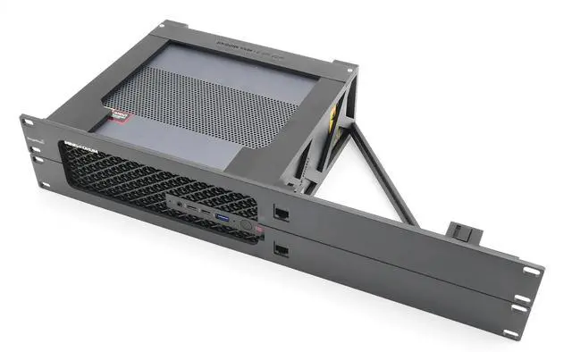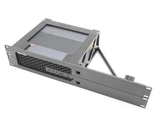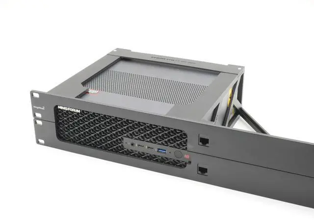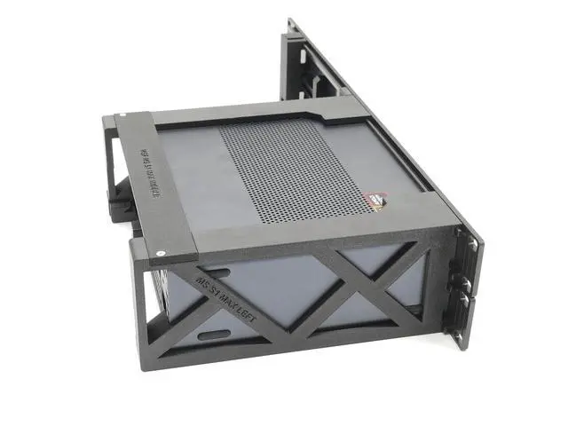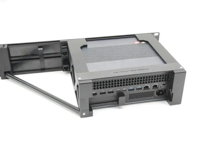 This rack mount is for the miniSforum MS S1 MAX model - 19 inch 2Uheight - color black. 2 pcs RJ45 keystones CAT6 included. Suitable for both standing and angled racks. The front panel is injection molded ABS/PC plastic for strength and great surface finish, the rear arms are 3D printed in PETG plastic.