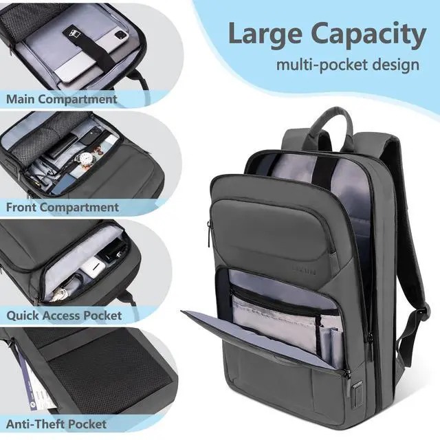 Expandable & Large CapacityThis travel laptop backpack for men fits most 17.3 inch laptops. The work backpack for men weigh only 900g (2 lbs), The computer backpack capacity can be expanded from 15 liters to 25 liters. The standard size18 x 12 x 3 inch. Ideal for work, commute or college. The expanded size18 x 12 x 7 inch. Ideal for travel, vacation or business. This casual lightweight backpack suitable for any occasion. ^^ USB Charging PortThis business backpack for men features a built-in USB charging port, allowing you to conveniently charge your devices on the goperfect for business trips or vacations (power bank is not included).