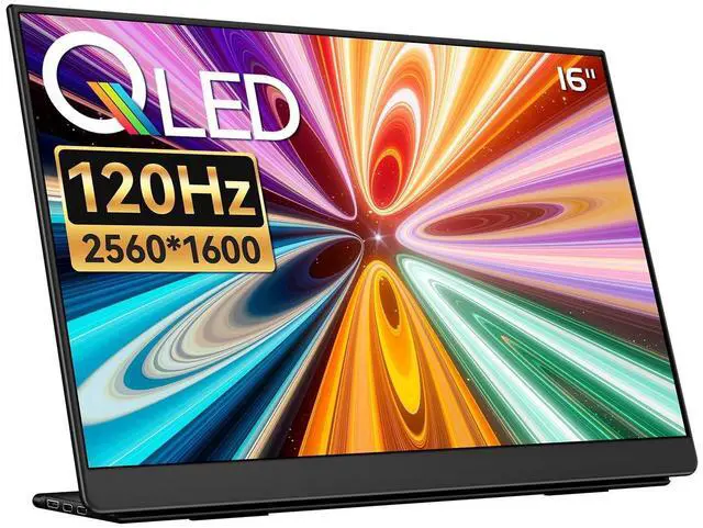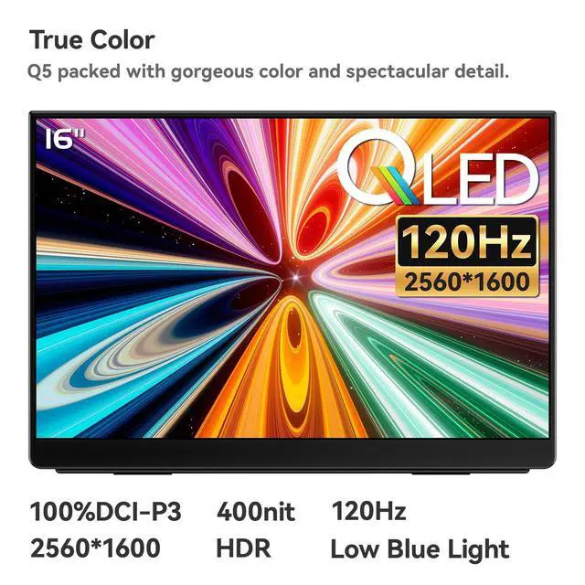 Ultra-Smooth 2.5K 120Hz QLED gaming experience. The QLED 2.5K 120Hz refresh rate and freesync technology eliminate screen tearing and stuttering, providing an advantage for all your gaming tasks and bringing you an immersive gaming experience, enjoying a buttery smooth gaming experience. ^^ A crystal clear 16" QLED screen display with a resolution of 2560*1600. The 16" 2560*1600 High-resolution portable display screen provides an astonishing aspect ratio of clearer, more realistic, and vivid images, accommodating more screen space, at the same time, the 850g is easy to carry, helping you work efficiently anytime and anywhere or connect gaming devices for gaming.