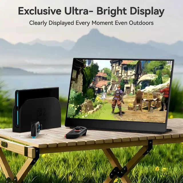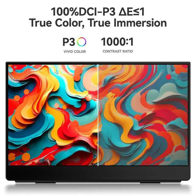 ^^ A crystal clear 15.6" QLED screen display with a resolution of 2560*1440. The 15.6" 2560*1440 High-resolution portable display screen provides an astonishing aspect ratio of clearer, more realistic, and vivid images, accommodating more screen space, at the same time, the 820g is easy to carry, helping you work efficiently anytime and anywhere or connect gaming devices for gaming. The four sided ultra narrow border design brings you an immersive visual experience. ^^ Portable & versatile second screen 100%DCI-P3. The lightweight and portable design, built-in bracket, make it easy to use as a laptop pc, the second screen of mobile phones and game consoles allows for work, entertainment, or streaming anytime, anywhere.