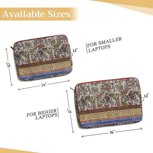 Artsy Designs and Vibrant patterns in vibrant colors provide huge visual interest, setting our bags apart. It is a versatile choice for just daily use, travel or commuting and a true delight to carry around. ^^ Comes in two sizes o Small 14 Width, 10 Length, 1.2 Deep (Outer dimension) Compatible with 12- 13.3 Laptops / Ultrabooks, 13- 13.5 Laptops / Notebooks / Ultabooks. o Large 16 Width, 11 Length, 1.2 Deep (Outer dimension) Compatible with 15 Macbook air / Macbook pro, 15.3 ipad pro and most 14- 14.56 Laptops / Notebooks / Ultrabooks.