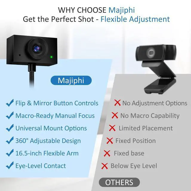 1080P WEBCAM - This webcam for pc supports 1080P resolution and features Manual focus, delivering crisp, vivid images and smooth video to capture every detail. It's the perfect choice for home offices ^^ FLEXIBLE SUPPORTING FRAME - This webcam for laptop features a freely adjustable gooseneck stand (40 cm) for effortless angle positioning. A physical sliding privacy cover effectively protects the lens, while the USB cable measures 150 cm and comes with a dedicated desktop clamp ^^ NOISE-CANCELING MICROPHONE - This streaming camera features an advanced noise-canceling microphone that filters out ambient noise, ensuring your voice remains clear and loud even in noisy environments ^^ PLUG AND PLAY - This pc camera for pc desktop supports USB 2.0 / 3.0 interfaces and requires no additional drivers.