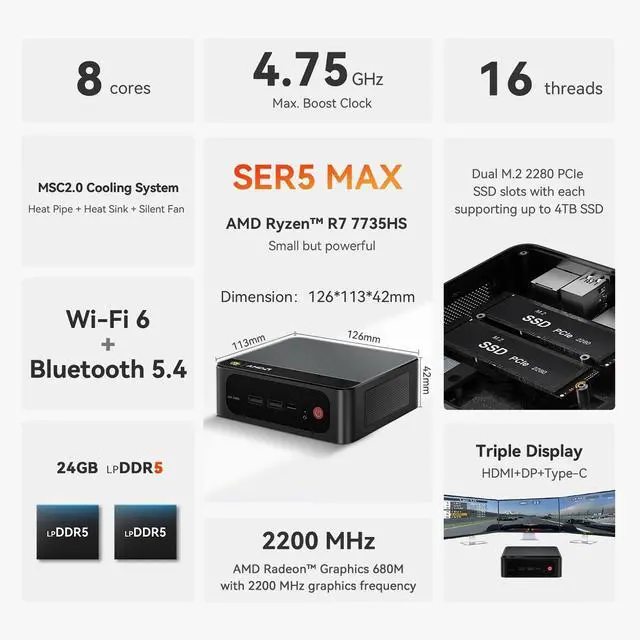 AMD Ryzen 7 MAX 7735HS ProcessorThe Beelink SER5 MAX mini pc is powered by AMD Ryzen 7 7735HS(8C/16T, up to 4.75 GHz, 16M Cache), Which can be widely used for home(video, music and Web browsing), office(PPT, AI, PS, PR) and gaming(Call of Duty, Fall Guys, LOL, etc). ^^ High Capacity & Expansion OptionsThe mini computer built-in 24GB (12GB*2) LPDDR5 RAM. LPDDR5 offers higher performance and lower power consumption to support stable operation of applications. It also comes with 500GB M. 2 SSD NVMe 2280 which can be upgraded to 8TB (2*4TB, not included), supporting smoother system operation, faster software launches, and more efficient processing.