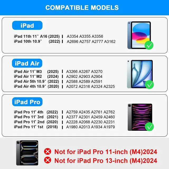iPad case with keyboardCompatible with iPad A16 11th generation 11 inch 2025; iPad 10th generation 10.9 inch 2022; iPad Air 11 inch M3 2025; iPad Air 11 inch M2 2024; iPad Pro 11 inch 4th 2022; iPad Pro 11 inch 3rd 2021; iPad Pro 11 inch 2nd 2020; iPad Pro 11 inch 1st 2018; iPad Air 5th 10.9 inch 2022; iPad Air 4th 10.9 inch 2020. ^^ Built-in Touchpad The iPad 10th generation case with keyboard is equipped with a built-in touchpad, enabling users to operate the iPad effortlessly without a mouse.