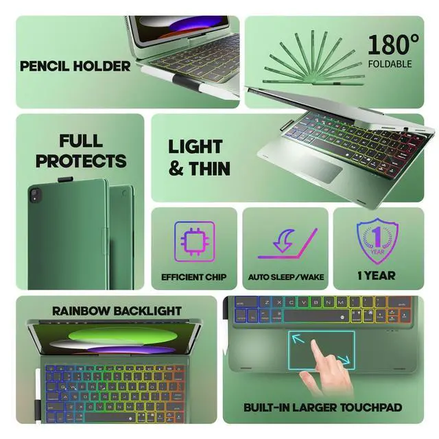 It allows you to control the iPad in a whole new way. Easily edit documents and surf the web, signifcantly boosting your productivity and providing a seamless, convenient operating experience. ^^ 7-Color BacklitThis keyboard for ipad 10th generation features a rainbow backlight. iPad 10th generation case with keyboard has 3 adjustable brightness levels, allowing you to customize the backlight brightness according to your personal preferences and ambient lighting conditions. Whether you're using it in a dimly lit room or a brightly lit space, this feature will provide you with a more enjoyable typing experience when using the 10th gen ipad case with keyboard.
