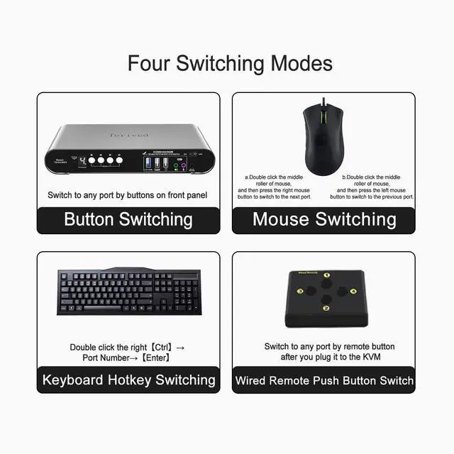 RGB 4:4: 4 HDR10, Auto-Scan, Auto-Detection, Hot Plug & Play, and HDCP compatibility. It's designed for use with Windows 11/10 ^^ Aluminum Alloy Shell - Our commitment to delivering the highest quality led us to choose aluminum alloy for the shell. This material not only provides a premium appearance but also ensures superior drop resistance, lightweight durability, and exceptional corrosion resistance. ^^ Digital Display - This 4-port KVM switch Quad Monitor features a digital display, allowing you to easily see the current channel, even in low-light conditions. ^^ Hotkey Switching and Wired Remote - Tired of manual button switching? This product offers several convenient methods to switch, including a one-button switch, keyboard hotkeys, and a wired remote control. Please note that certain programmable or high-speed keyboards may not be compatible with the hotkey function. If your keyboard are unresponsive, consider deactivating the hotkey feature by pressing the front hotkey on/off button. ^^ KVM Switch with Audio and Microphone Port - This Quad monitor KVM switch comes equipped with an audio and microphone port, enabling easy connection of your 3.5 mm speaker and microphone.